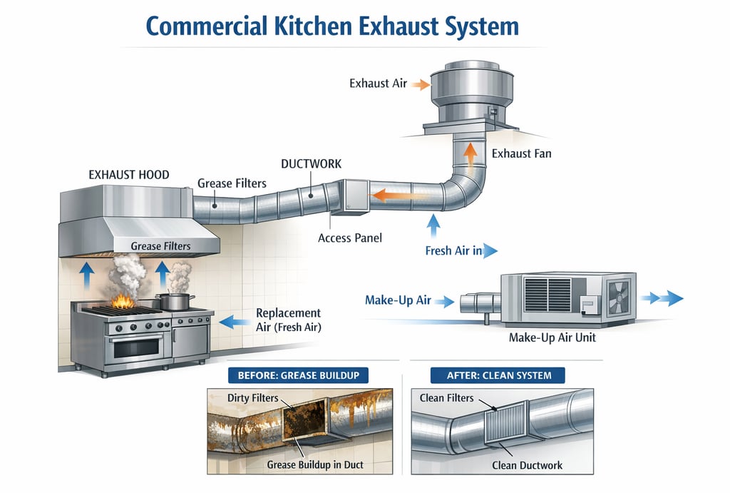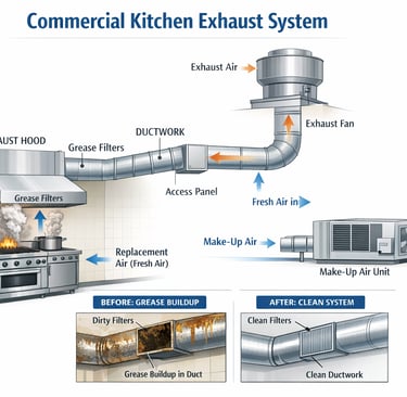 In every commercial kitchen, the exhaust system works hard behind the scenes. It removes heat, smoke, and grease from cooking areas—but when it’s not properly maintained, it can quickly become a serious fire hazard.